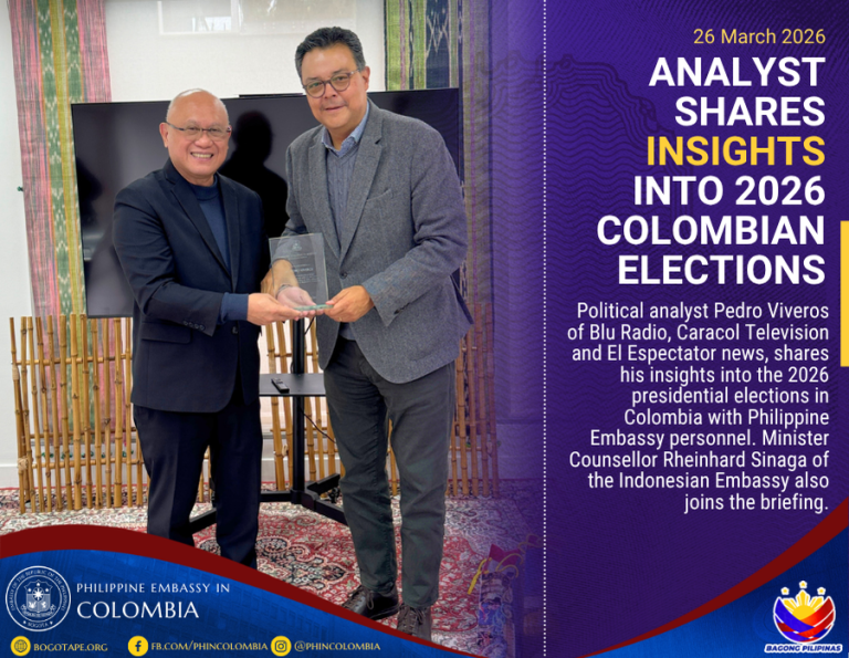 Political analyst Pedro Viveros of Blu Radio, Caracol Television and El Espectator news, shares his insights into the 2026 presidential elections in Colombia with Philippine Embassy personnel. Minister Counsellor Rheinhard Sinaga of the Indonesian Embassy also joins the briefing.