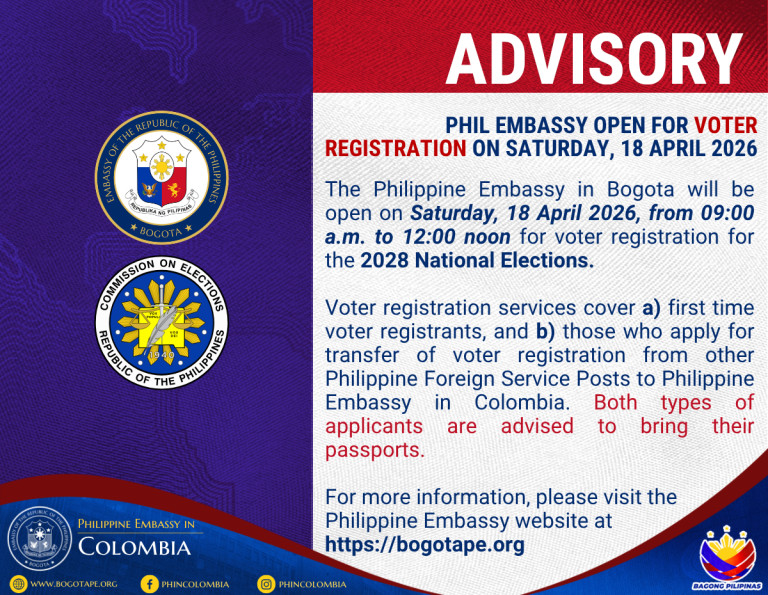 The Philippine Embassy in Bogota will be open on Saturday, 18 April 2026, from 09:00 a.m. to 12:00 noon for voter registration for the 2028 National Elections.