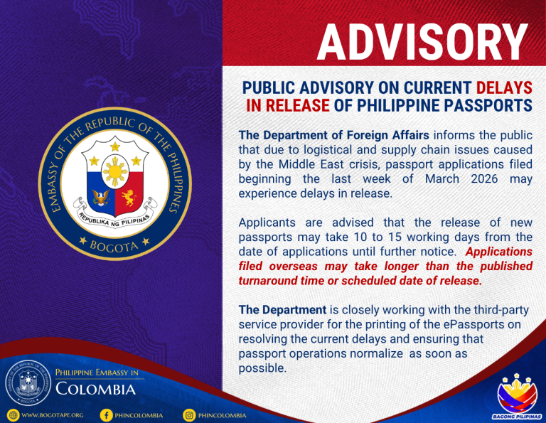 The Department of Foreign Affairs informs the public that due to logistical and supply chain issues caused by the Middle East crisis, passport applications filed beginning the last week of March 2026 may experience delays in release.
