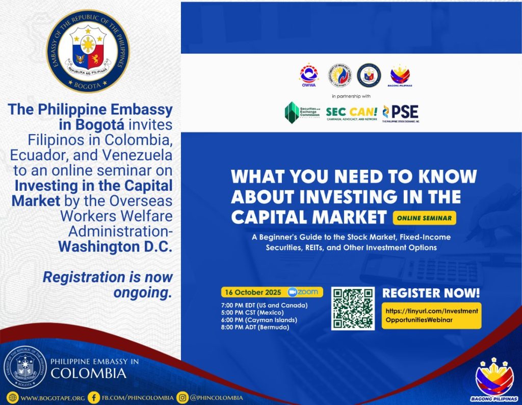 The Philippine Embassy in Bogota invites Filipinos in Colombia, Ecuador, and Venezuela to an online seminar on Investing in the Capital Market